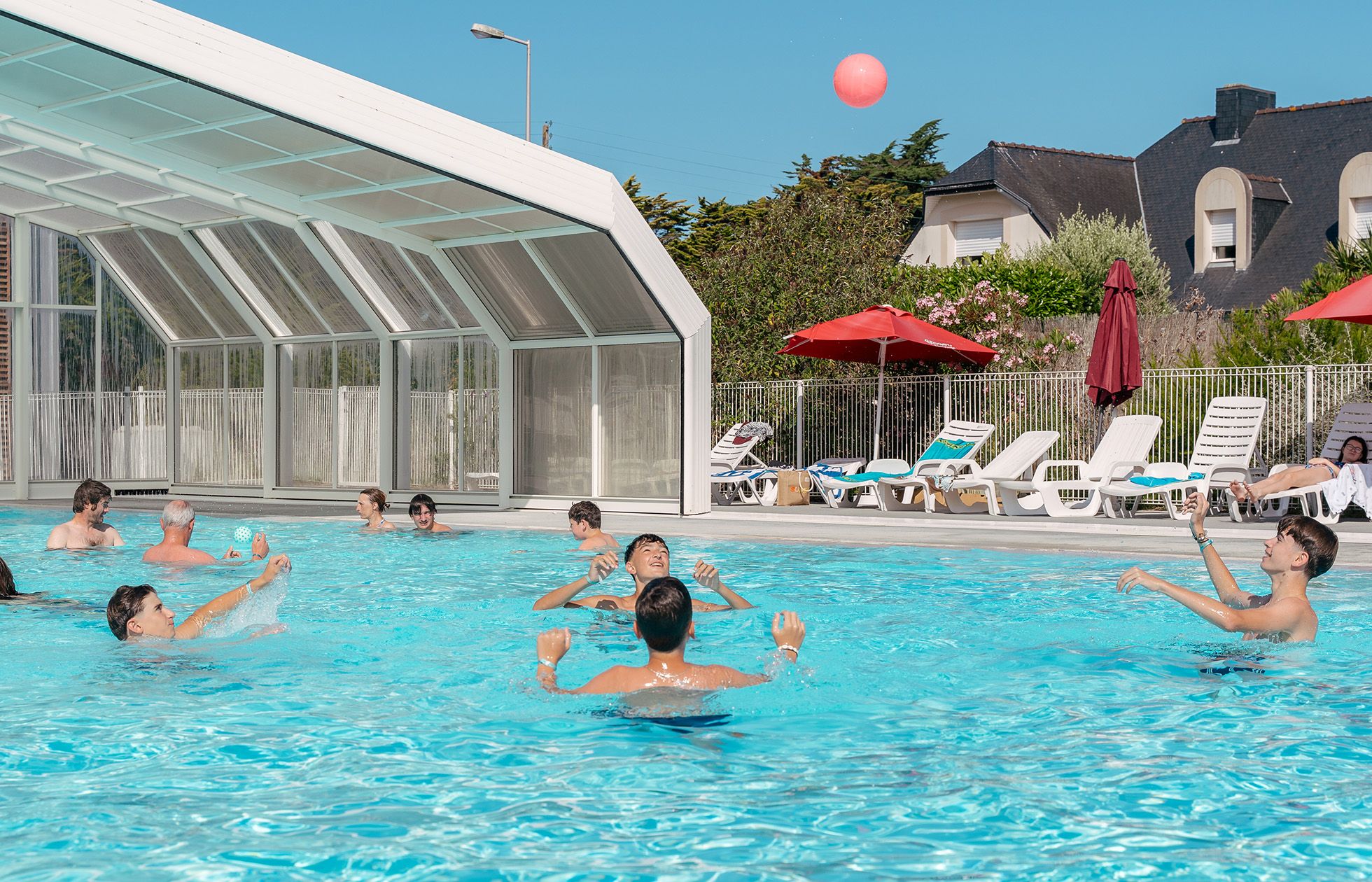 - Espace aquatique avec piscine chauffée de 250m² (couverte ou découverte selon conditions météo), espace pataugeoire de 100m², 3 toboggans aquatiques, transats